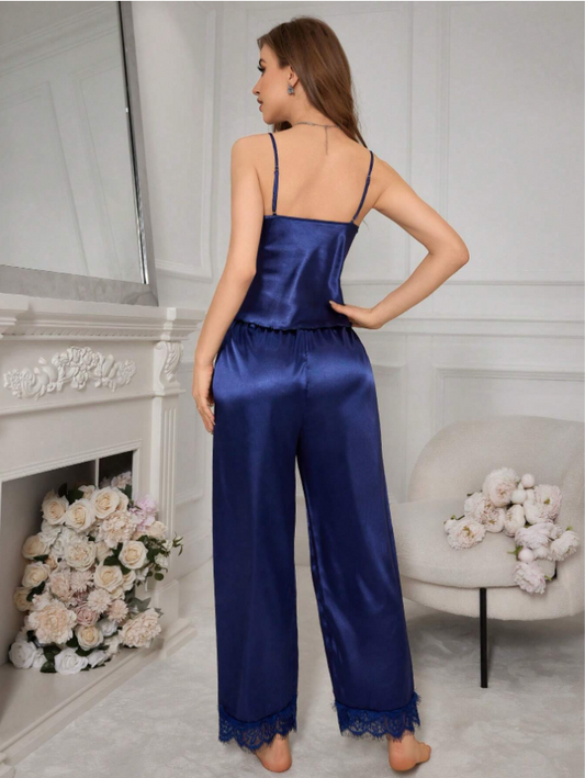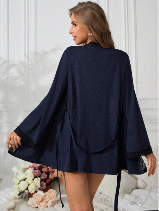Contrast Lace Belted Satin Robe & Cami Top & Shorts PJ Set