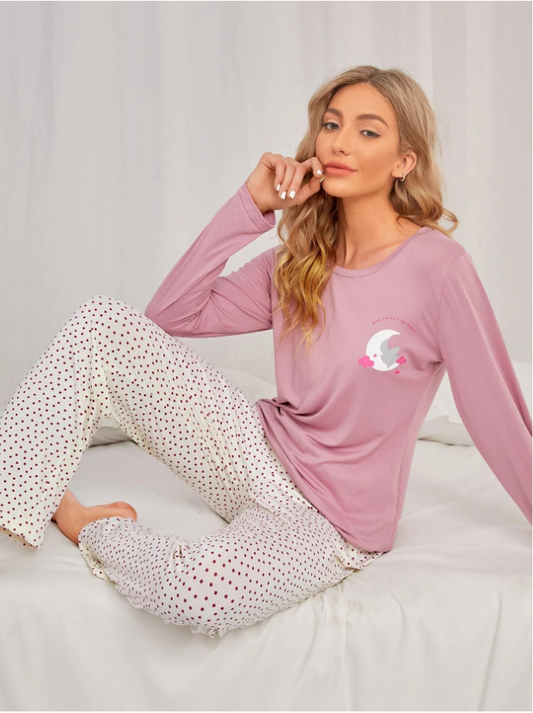 Moon And Slogan Graphic Tee & Polka Dot Print Pants PJ Set