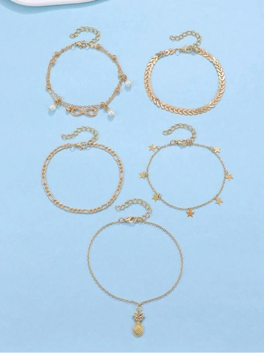 5pcs/Set Fashionable Gold Pineapple, Star & Pearl Anklet