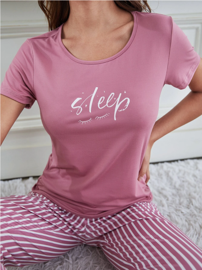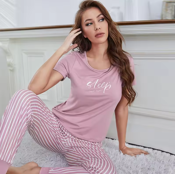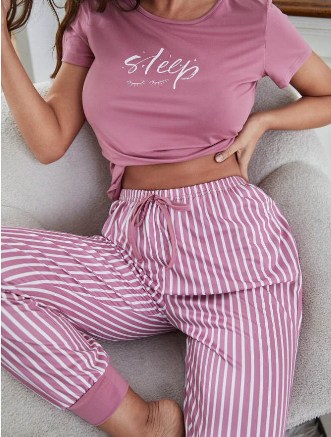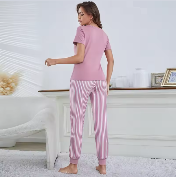 High Quality Women's Pajamas Two-Piece Crew Neck Short Sleeve + Striped Trousers Home Suit Women'S Sexy Pajamas